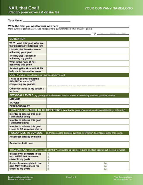 This comprehensive package of 10 goal setting tools covers every aspect of goal-setting. Brainstorm ideas, set specific, meaningful goals—and ensure clients commit and take action.